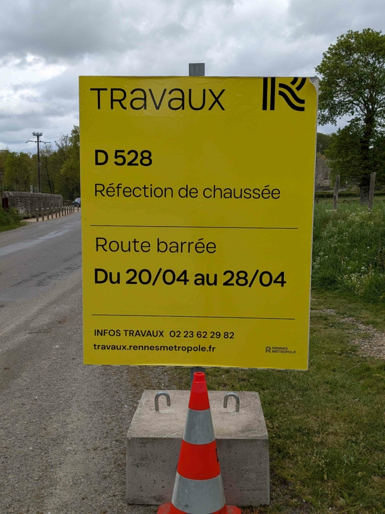 Des travaux de réfection de chaussée ont lieu du lundi 20 au mardi 28 avril 2026, sur la RD528 en direction de Liffré.